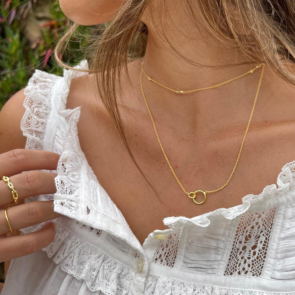 @alexismaymcmullin in the Venice Mini Necklace, Pearl Charm Necklace, Rose Ring, and Venice Bracelet.